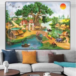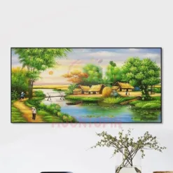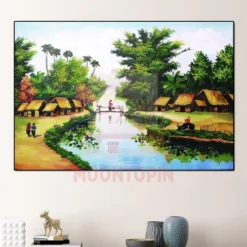 Countryside paintings are artworks that capture the serene beauty of rural life, featuring images of fields, rivers, thatched-roof houses, and simple daily activities. These paintings evoke a sense of tranquility, warmth, and nostalgic memories of home.